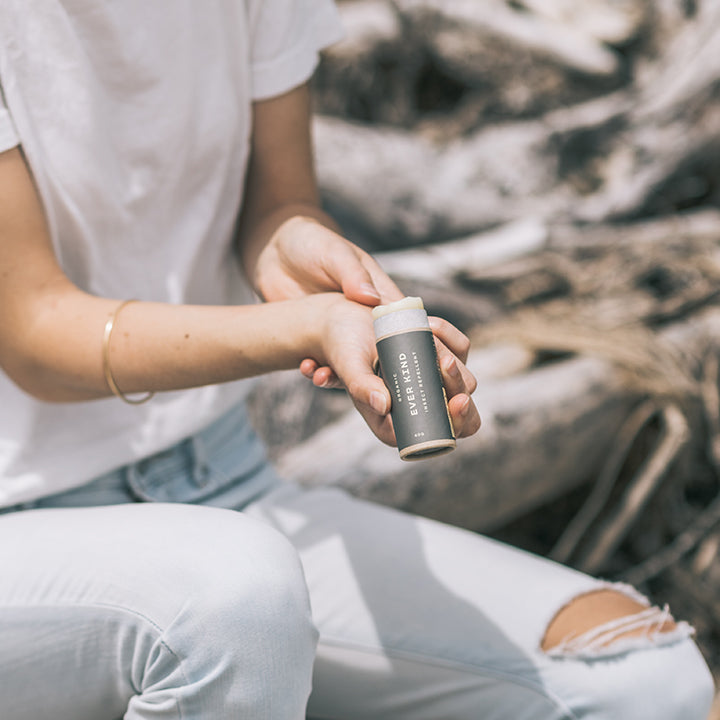 Flat lay of Everkind's All Set for Summer Bundle including deodorant, insect repellent, lip balm, and Summer body balm, all in compostable packaging on a warm yellow background.